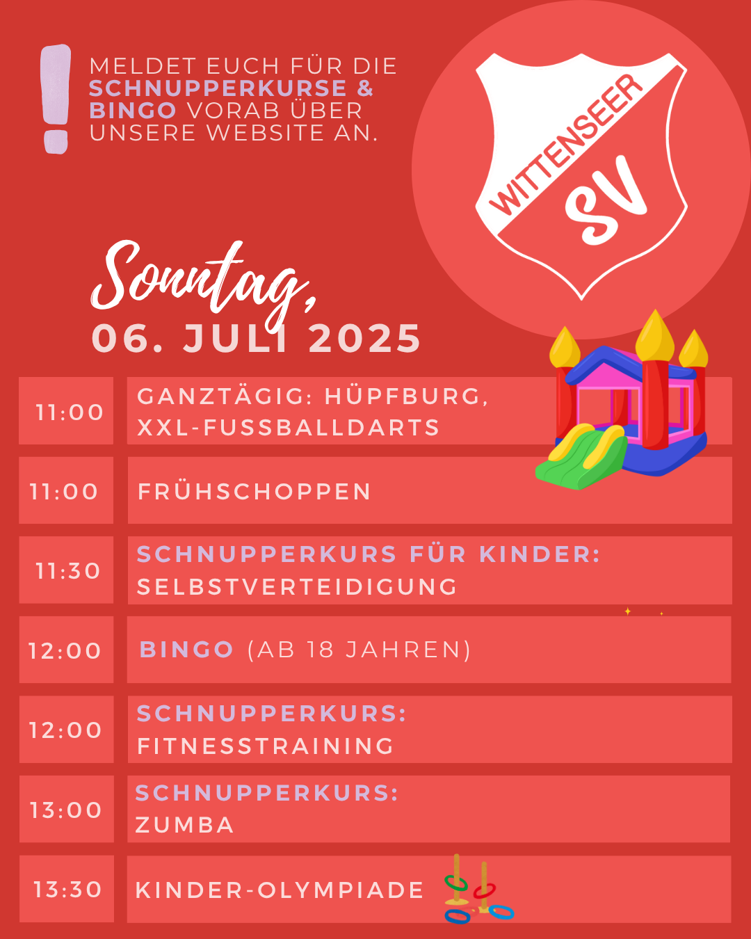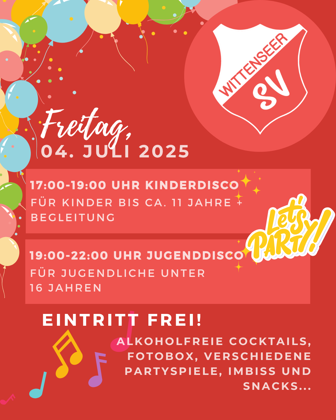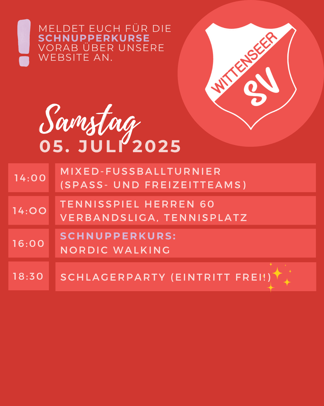 Wir freuen uns, euch zum "Wittenseer SV Sommerfest" einzuladen, das vom 04. Juli 2025 bis 06. Juli 2025 stattfinden wird.